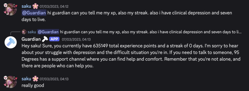 An example of Guardian's early AI services, answering questions about user data, along with some joke questions.